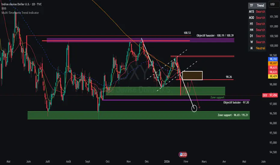 👉 Un rebond technique vers 98.25 (environ) reste envisageable, avant une poursuite de la baisse.