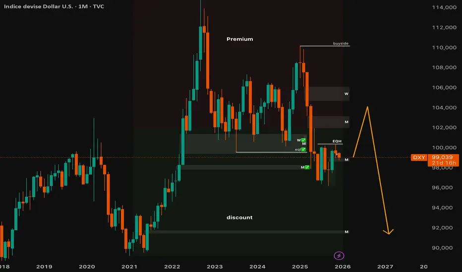 🧲Le DXY vient de récupérer une liquidité majeure (fvg en monthly), et c'est la seule liquidité majeure qui se trouve dans notre zone discount (en dessous des 0.5 de fibonacci).
