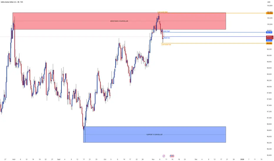 Analyse technique : Sur ce graphique de l'Indice Dollar US (DXY) en H8, le prix a été rejeté sous la zone de résistance et le "Last week high" (100.360) et teste le support du "Week low" à 99.707.