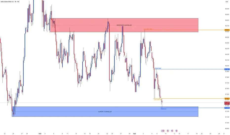 Analyse technique : DXY arrive sur le gros support 97,30–97,60 (week low) : un rebond validé par la reprise de 97,42 puis 97,84 relancerait vers 98,63/98,80, tandis qu’une cassure franche sous 97,30 prolongerait la baisse vers 97,00–96,80.