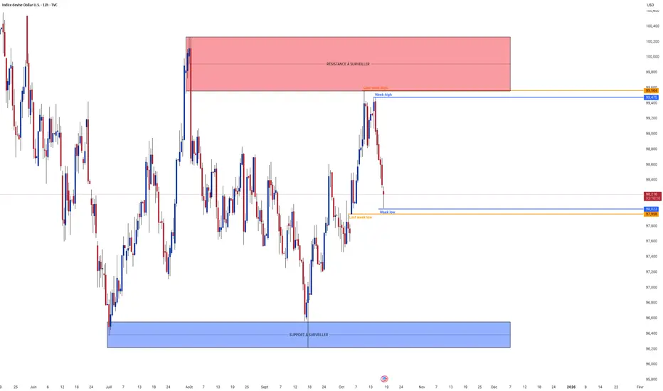 Analyse technique : Le DXY arrive sur le week low ~98,0 : un maintien/retournement ici pourrait relancer un rebond vers 99,25 puis 99,65 (zone de résistance), tandis qu’une cassure nette sous 97,95 ouvrirait 97,30 puis le support majeur 96,3–96,0.