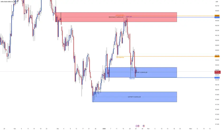 Analyse technique : Le DXY valide un rebond technique sur le support des 98.250, une zone de liquidité qui freine pour l'instant la dynamique baissière intraday. Ce pivot favorise une reprise vers l'Order Block situé à 99.000, à condition de s'affranchir de la résistance intermédiaire à 98.700. Une clôture H8 confirmée sous les 98.100 invaliderait ce scénario de rebond et ouvrirait la voie à une poursuite de la baisse vers les 97.800.