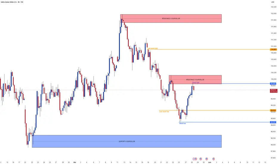 La baisse pourrait se poursuivre vers 99.000 à nouveau mais on devra aussi surveiller les possibilités de cassure à la hausse vers 100.200 et une continuation de la hausse plus forte vers 100.500