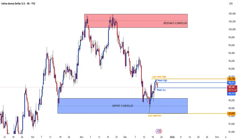 Analyse technique : Sur ce graphique de l'Indice Dollar US (DXY) en H8, le prix reste sous une pression vendeuse persistante et continue de tester la solidité du support critique à 98.138.