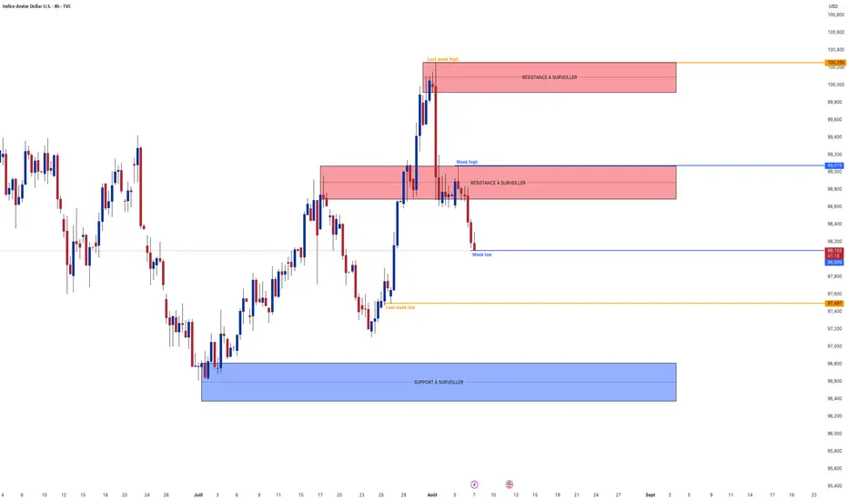 Analyse technique : Ce setup du DXY montre un rejet clair sous la résistance intermédiaire des 99.075, avec une pression vendeuse qui pourrait pousser le prix vers le dernier creux hebdomadaire à 97.497 voire la zone de support majeure autour de 96.800, tandis qu’un rebond au-dessus des 98.200 relancerait un potentiel retour vers les 99.075 puis 100.255.