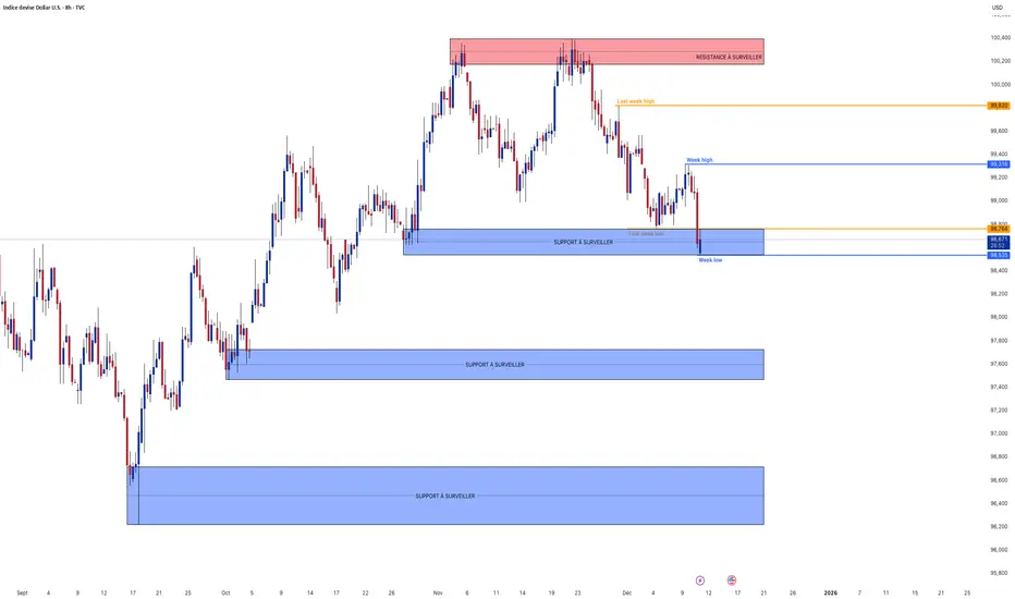 Analyse technique : Sur ce graphique de l'Indice Dollar US (DXY) en H8, le prix poursuit sa correction et teste actuellement la zone des plus bas située entre 98.764 (Last week low) et 98.535 (Week low).