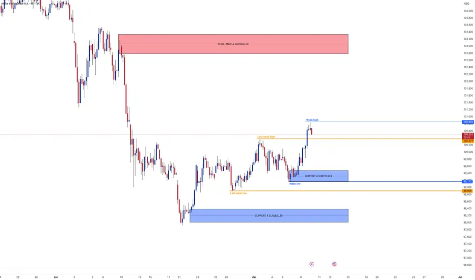Pour ce vendredi il peut poursuivre sa hausse vers 102.000 mais il faudra aussi surveiller les possibilités de retracement ou de baisse vers 100.000 voir 99.500
