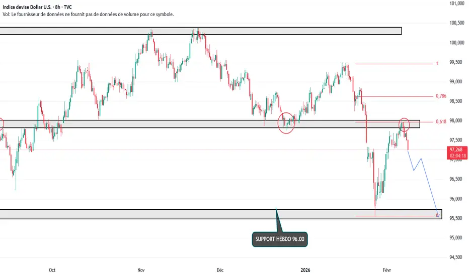 Le Dollar Index (DXY) évolue actuellement dans une structure affaiblie après avoir rejeté une zone de retracement clé autour de 98,0–98,2 correspondant au niveau Fibonacci 0,618 et à une ancienne zone de support devenue résistance. Le rebond technique observé depuis le support hebdomadaire proche de 96,0 montre que les acheteurs restent présents à long terme, mais la dynamique court terme demeure fragile avec une incapacité du prix à réintégrer durablement la zone supérieure.