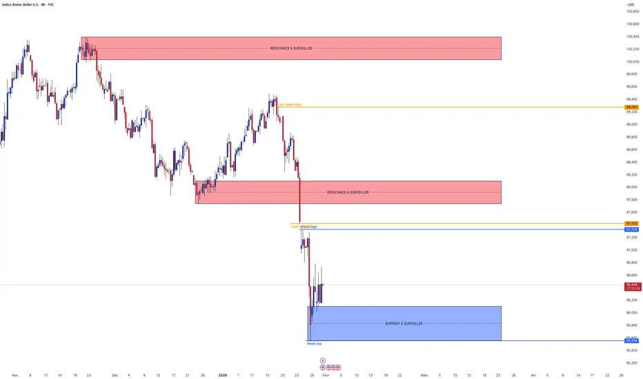 Analyse technique : Le DXY est actuellement sur le "fil du rasoir", testant une nouvelle fois le support critique des 96.000. Après la volatilité post-FOMC, le Dollar ne parvient pas à s'extraire de sa zone de danger. La structure reste lourdement baissière en H8 et Daily, et ce niveau des 96.000 agit comme le dernier rempart avant une capitulation vers les 95.000.