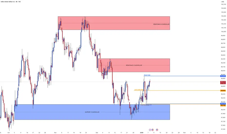 Le scénario haussier nécessite une cassure franche de ce plafond pour viser la zone majeure des 99.250, tandis que le scénario baissier prévoit un rejet sous ce niveau pour un retour vers le support immédiat des 98.500.