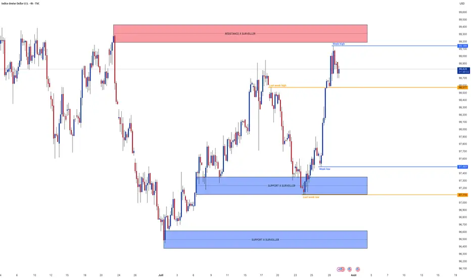 Analyse technique : Le DXY évolue sous une résistance hebdomadaire clé après avoir cassé son plus haut de la semaine, et pourrait soit prolonger sa hausse vers la zone de résistance majeure des 99.400–99.500, soit amorcer un retracement vers les anciens niveaux de breakout autour des 98.670 voire le support à 97.493 en cas de rejet confirmé.