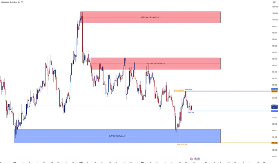 Analyse technique : DXY en range de reprise : un passage au-dessus de 97,80/97,82 (week/last week high) ouvrirait la voie vers la résistance 98,5–99,0, tandis qu’une cassure du week low 97,20 relancerait la baisse vers 96,90 puis la zone de support 96,3–96,2.