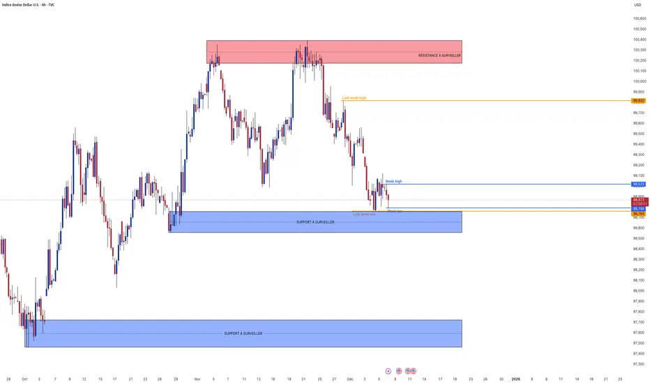 Analyse technique : Sur ce graphique de l'Indice Dollar US (DXY) en H6, le prix est en phase de repli après avoir échoué à franchir 100.286 et s'approche du support à 99.375.
