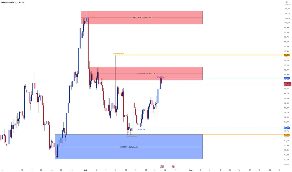 Analyse technique : Le DXY reteste la résistance 98,80–99,10 (autour du *week high* 98,83) : une cassure/maintien au-dessus de 98,83–99,00 ouvrirait la voie vers 99,32 (last week high) puis la zone 100, tandis qu’un rejet sous ce plafond exposerait un repli vers 98,10 puis 97,80/97,63 (*week low/last week low*) et potentiellement le bloc de support 97,00–97,70.