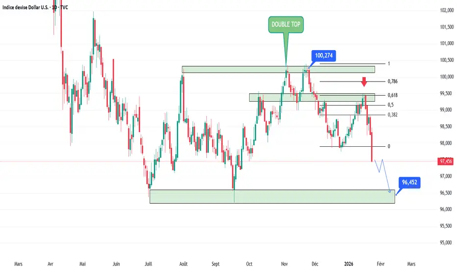 Le DXY (Dollar Index) montre actuellement une structure clairement baissière après l’échec sous la zone de résistance majeure autour de 100,20–100,50, matérialisée par une figure de double top visible sur le graphique journalier. Ce rejet s’est produit au niveau d’une zone d’offre clé, renforcée par les retracements de Fibonacci (0,786–1), ce qui a déclenché une pression vendeuse marquée.