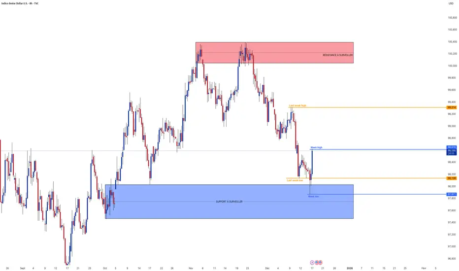 Analyse technique : Sur ce graphique de l'Indice Dollar US (DXY) en H8, le prix est sous une forte pression vendeuse et teste la zone de support critique des 98.138 (Last week low).