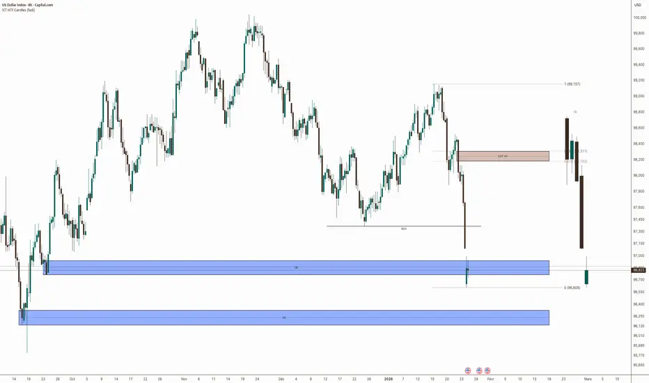 Le DXY évolue actuellement au-dessus du support des 96.700, tentant de stabiliser sa chute après une pression vendeuse massive. Cependant, comme vous l'avez souligné, la structure journalière (D1) reste lourdement baissière, ce qui suggère que ce maintien au-dessus des 96.700 n'est probablement qu'une pause technique ou une consolidation latérale avant une éventuelle continuation du flux vendeur.
