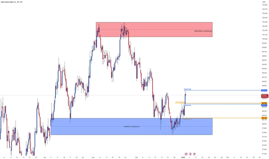 Analyse technique : Sur ce graphique de l'Indice Dollar US (DXY) en H8, le prix a effectué un breakout haussier au-dessus de ses pivots récents pour s'installer autour de 98.700. Le scénario haussier anticipe désormais une poursuite vers la résistance majeure de 99.250, tandis que le scénario baissier surveille un éventuel test de l'ancienne zone de rupture à 98.420 pour confirmer le changement de polarité.