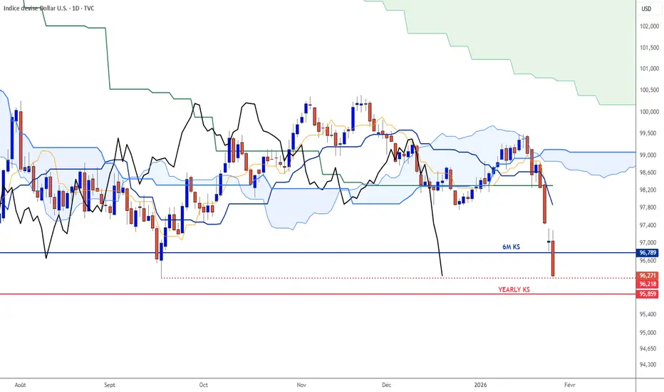 Le Dollar US est sur le point de trouver la Kijun annuelle en support (possiblement avec le FOMC demain). C'est une droite de signal, ce qui sous entend que sa cassure donnerait un signal de poursuite baissière pour cette année 2026.