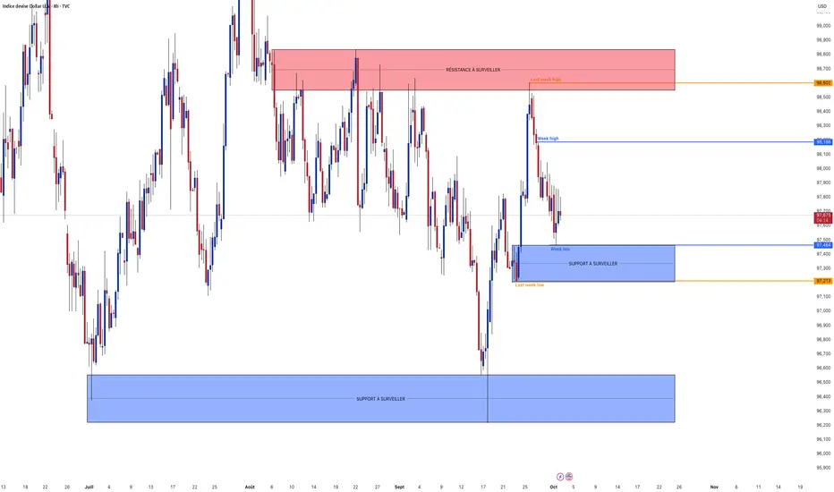 Analyse technique : DXY évolue entre 97.45–97.50 (support/“week low”) et 98.18 (week high) : un rebond au-dessus de 97.45/97.21 relancerait la hausse vers 98.18 puis 98.60–98.90 (résistance), tandis qu’une cassure nette sous 97.45/97.21 ouvrirait une jambe baissière vers la grande zone de demande ~96.5.