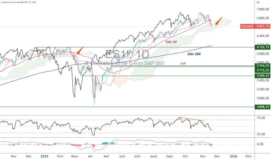 L’indice S&P 500 (le contrat future S&P 500 dans cette analyse) se trouve actuellement à un point d’inflexion décisif sur le plan technique. Après plusieurs mois de progression soutenue depuis la chute de mars/avril dernier, les cours reviennent tester une zone charnière où convergent plusieurs supports dynamiques : le nuage daily du système Ichimoku, la moyenne mobile à 50 jours (SMA 50) et, plus bas, la moyenne mobile à 200 jours (SMA 200) qui rejoint l’ancien record historique des 6150 points. Cette confluence d’indicateurs fait de la période actuelle un véritable moment de vérité graphique pour le marché actions US et les actions des GAFAM.