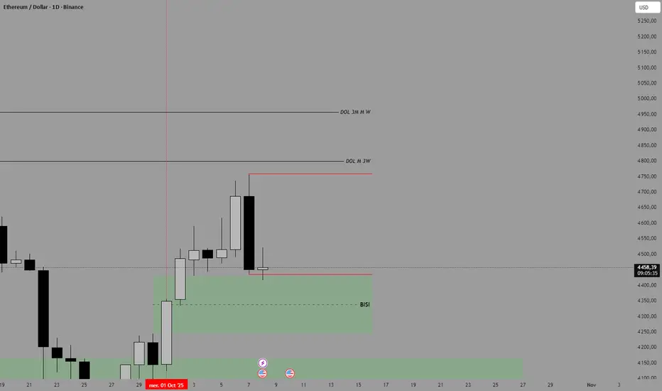 3 Weeks => Clôture de la bougie du 04 Aout au-dessus du high de la précédente => Prise des 50% de celle-ci => Première DOL le high de la bougie du 25 Aout => Deuxièmes DOL High de la bougie précédente 04 Aout => Prise du FVG en dessous