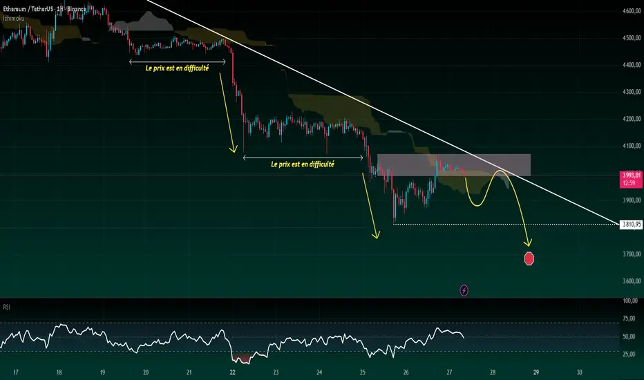 ETH continue d'être sous pression dans le canal de réduction lorsque de nombreuses tendances contre la résistance échouent. Actuellement, le prix est en difficulté autour de la superficie de 3 950 à 4 000 USD, juste à proximité du nuage d'Ichimoku, mais la force d'achat est faible.