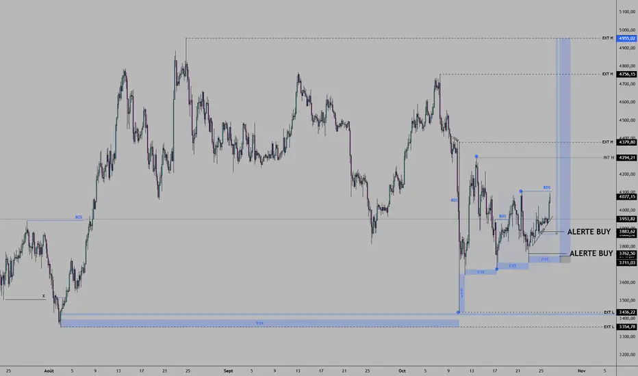 Le marché a effectué une structure haussière confirmée (BOS) après une longue phase de compression. On observe une série de Break of Structure (BOS) successifs avec une dynamique ascendante, indiquant une reprise de liquidité acheteuse et un retournement de la structure interne.