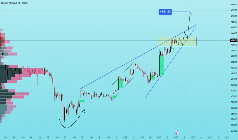 La paire ETH/USDT sur BINANCE maintient une configuration de biseau ascendant, accumulant autour de 4 350 – 4 420 $. Les zones FVG apparaissent continuellement, indiquant un pouvoir d'achat toujours maintenu, et la ligne de tendance maintient une tendance haussière constante. Si ce support se maintient, l'objectif à court terme se situe vers 4 591 $.