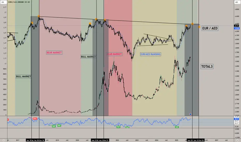 on peut voir qu'a chaque fois que EUR performe, et commence a se retourne, avec des divergence baissiere, c'est l'annonce du debut d'une grosse poussé sur les altcoins.