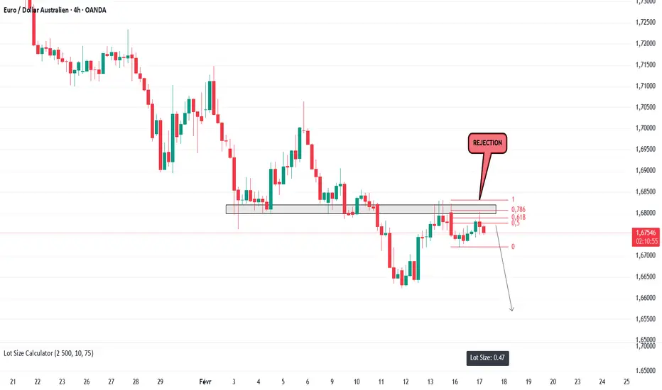 L'analyse technique de l'EURAUD en unité de temps 4h montre une structure de marché dominée par un flux vendeur persistant. Après une phase de correction technique, le prix est venu buter précisément sur la zone de résistance située au niveau des 0,786 de retracement de Fibonacci, créant un signal de "REJECTION" (rejet) très clair. Ce rejet s'est manifesté au contact d'un ancien bloc de contrats (zone grise), confirmant que cette zone de prix agit désormais comme une barrière solide pour les acheteurs.