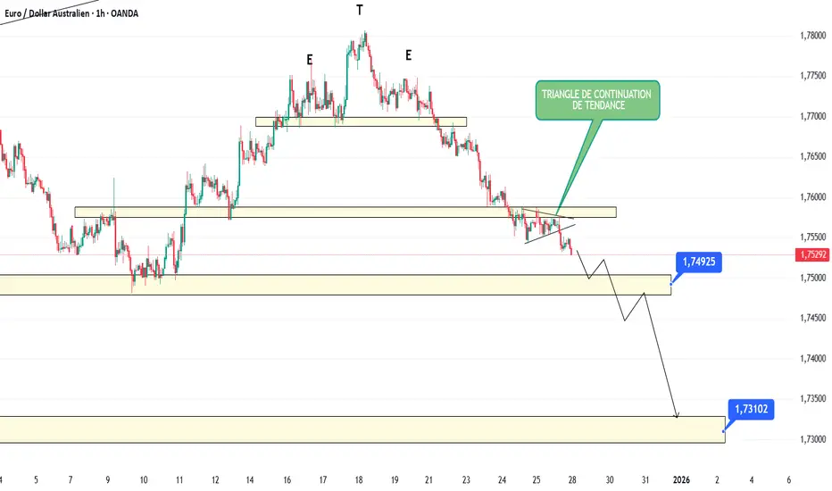 La cassure baissière du triangle confirme la pression vendeuse, avec un premier objectif situé sur la zone de liquidité autour de 1.7490, correspondant à un support intermédiaire. En cas de rupture nette de cette zone, la poursuite du mouvement pourrait amener le prix vers la zone de support majeure vers 1.7310, alignée avec un niveau de demande H1/H4.