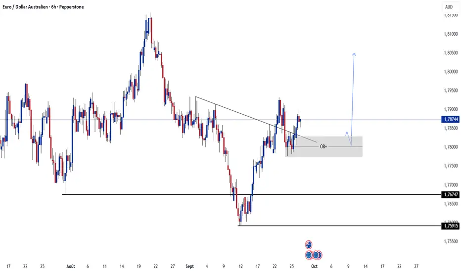 EURAUD reteste l’OB et l’ancienne trendline cassée : un maintien/rejet haussier au-dessus de ~1,7810 ouvrirait la voie vers 1,7950 puis 1,8000, tandis qu’une réintégration sous l’OB exposerait un repli vers 1,7675 puis 1,7590.