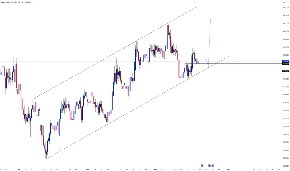 Le setup EURAUD montre une structure haussière claire dans un canal ascendant, et tant que le prix maintient sa position au-dessus du bas du canal et du support à 1.78021, un rebond vers les sommets précédents reste probable — à l’inverse, une cassure franche de ce niveau invaliderait le scénario acheteur à court terme.
