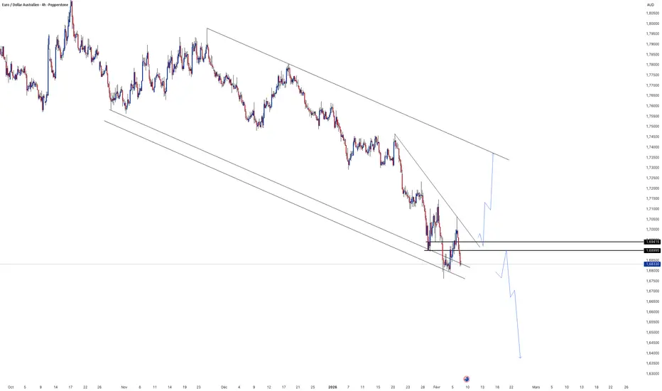 Le EURAUD confirme sa capitulation ce dimanche, le prix s'installant sur les 1.68000 après une semaine de pression vendeuse intense. Comme vous l'avez souligné, la structure est désormais "complètement baissière" en H4, invalidant tous les scénarios de rebond observés fin janvier. Cette accélération est le fruit d'une divergence monétaire qui s'accentue : alors que l'Europe navigue dans une reprise fragile, l'Australie a repris les armes contre l'inflation, rendant le Dollar Australien (AUD) particulièrement attractif sur les cross.
