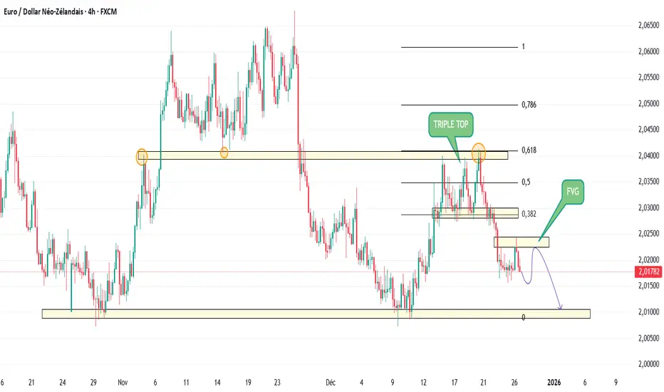 La paire EURNZD évolue actuellement dans un contexte baissier après un rejet clair sous une zone clé de retracement de Fibonacci 0.618, où le marché a formé un triple top, signal fort d’épuisement acheteur. Ce rejet s’est accompagné d’une impulsion baissière laissant derrière elle une Fair Value Gap (FVG) non comblée, renforçant la probabilité d’une poursuite du mouvement vendeur.Le prix consolide désormais sous la zone des 0.382–0.5, agissant comme résistance dynamique, ce qui maintient la pression vendeuse tant que cette zone n’est pas reconquise.