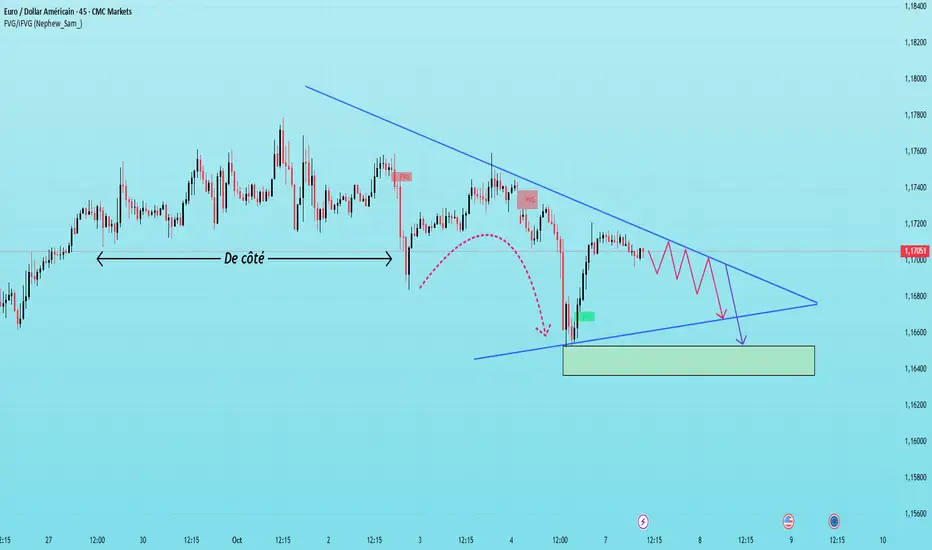 Sur le graphique, un triangle descendant se rétrécit et se complète progressivement. Le cours devrait poursuivre sa consolidation étroite avant de franchir la zone de support de 1,1650–1,1630, où une réaction technique d'achat à court terme pourrait se manifester. Si cette zone est franchie, la baisse pourrait s'amplifier.