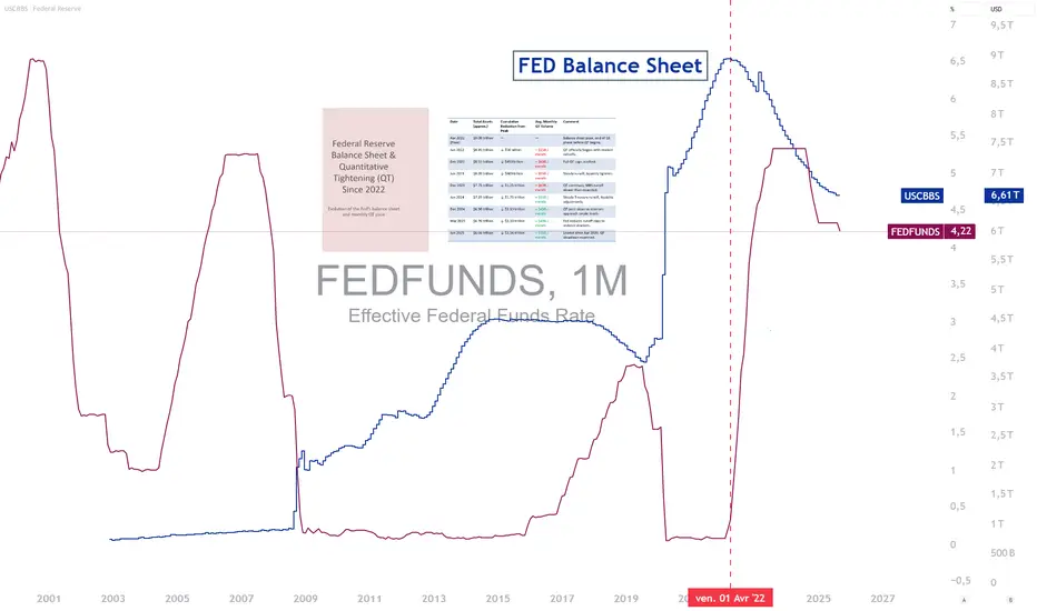 Depuis 2022, la Fed mène un QT pour retirer progressivement la liquidité injectée durant la période post-Covid. Concrètement, elle laisse expirer une partie de ses obligations d’État et de ses titres hypothécaires sans les remplacer. Résultat : la quantité de dollars en circulation diminue, les conditions de crédit se durcissent et la liquidité mondiale se contracte.