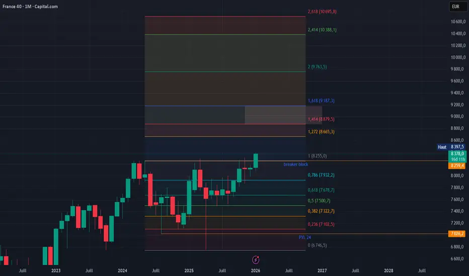 Fibonacci extension (du swing low ~6 700-7 000 vers highs ~8 200+) :1.0 : ~8 250 (breaker passé)