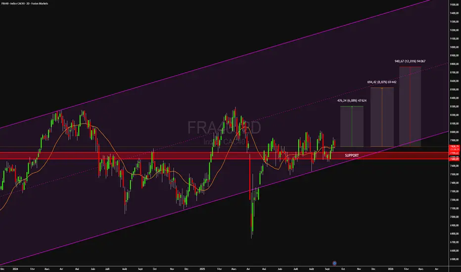 L’indice évolue dans un canal haussier long terme, parfaitement encadré par les obliques violettes.