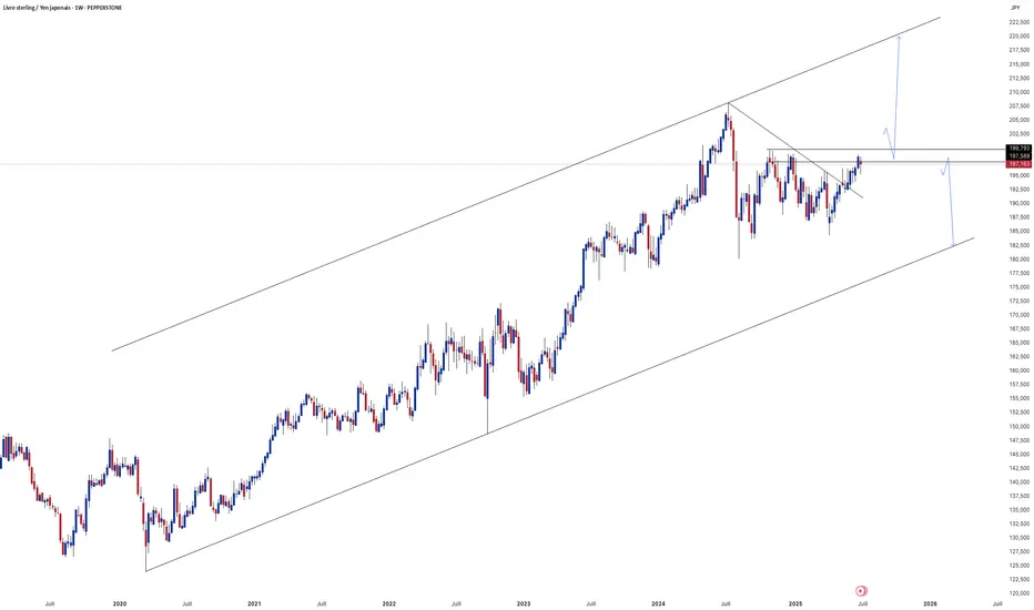 L’analyse hebdomadaire du GBPJPY révèle une configuration technique clé : le prix évolue depuis plusieurs années dans un large canal haussier, avec une zone de résistance majeure testée actuellement autour des 198–200. Cette zone coïncide avec un croisement de plusieurs niveaux techniques : une résistance horizontale historique et une ancienne trendline baissière récemment cassée. Deux scénarios principaux s’offrent aux traders : soit le prix casse nettement cette zone, validant ainsi une poursuite haussière vers la borne haute du canal autour de 215–220 ; soit il rejette violemment cette zone, conduisant à une correction technique vers les 185–180, qui correspondraient à la zone basse du canal. La clôture hebdomadaire sera donc décisive pour confirmer la direction dominante.