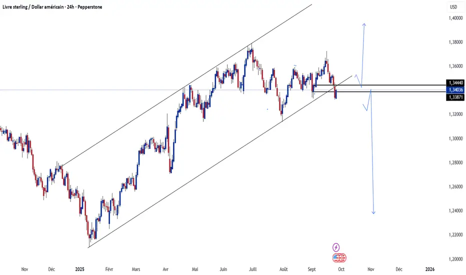 GBPUSD teste le bas du canal haussier : reprise au-dessus ~1,3440/50 (reclaim de la borne) relancerait un mouvement vers 1,36–1,38, tandis qu’une clôture quotidienne sous ~1,3387 (validation de la cassure) ouvrirait la voie à une glissade vers 1,31 puis 1,28/1,24.