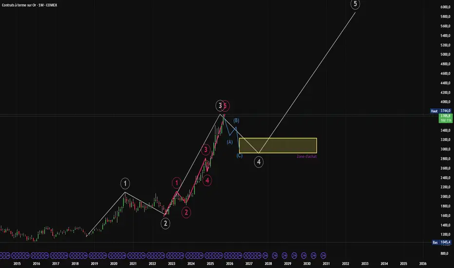 3️⃣ Nous venons de compléter la vague (3), une impulsion majeure qui a propulsé l’or vers ses plus hauts historiques.