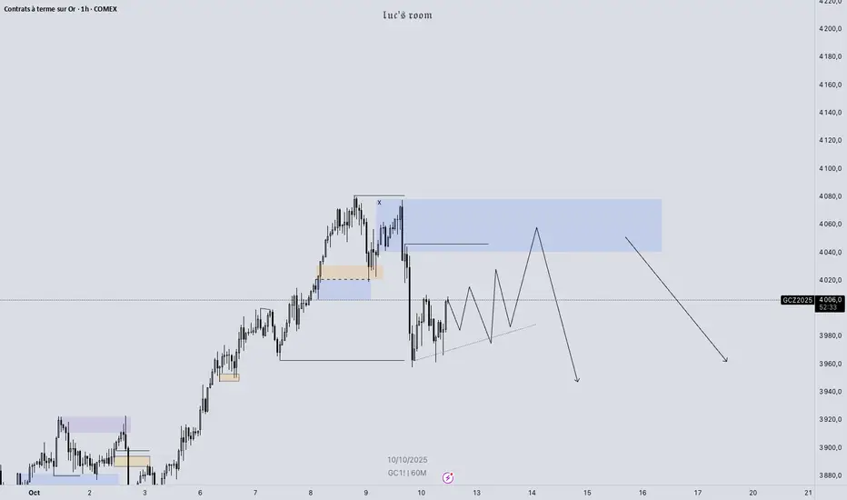 Comme annoncé hier, le Gold (XAU/USD) a parfaitement respecté notre scénario : il a pris les liquidités hautes, a relancé un nouvel ATH, puis a entamé une correction nette depuis la zone d’offre que nous avions identifiée.