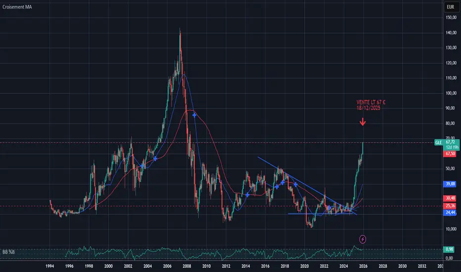 Il est extrêmement rare que je vende une action, cependant après la surperformance du cours SOCIETE GENERALE en 2025, le cours arrive sur une résistance majeure que je ne peux que vendre. Objectif : 46 €.