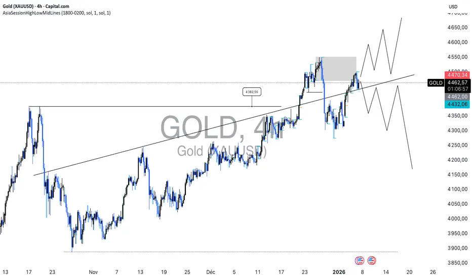 On attaque ce mercredi 7 janvier 2026 avec un Gold autour des 4 460$, toujours solidement installé dans une structure haussière propre en 4H.