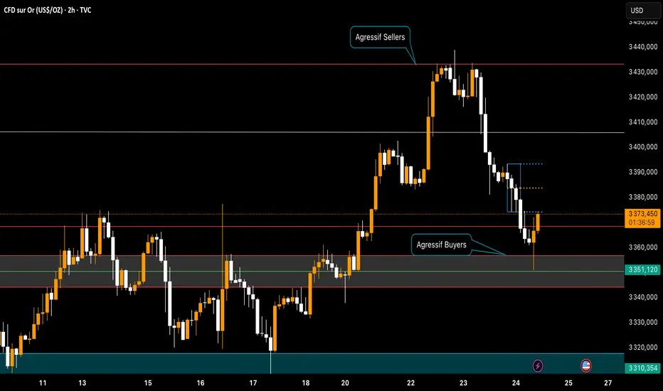 Le prix est actuellement autour de 3370, en légère reprise après avoir plongé depuis la zone de distribution située au-dessus de 3430. Un rejet clair par les vendeurs s'est matérialisé via une séquence de bougies baissières puissantes, conclue par une réaction des acheteurs dans la zone de demande 4H à 3351.