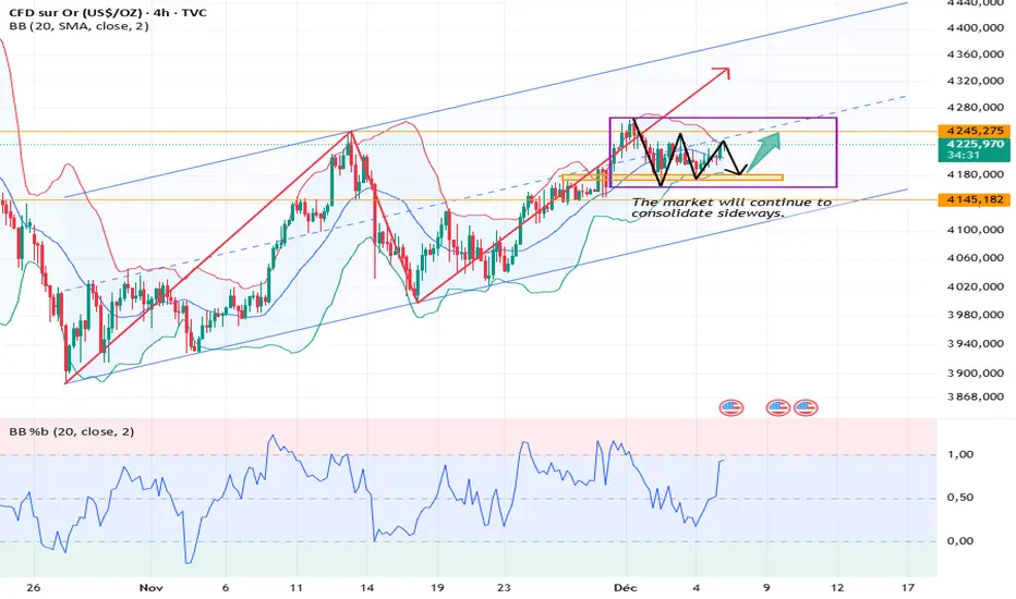 La bougie journalière de la veille a clôturé sur un doji, renforçant la confiance dans une tendance haussière à court terme. Cependant, l'évolution des prix au cours de la semaine écoulée a manqué de continuité, incitant à la prudence, car un retour à une phase de consolidation est possible. Les moyennes mobiles conservent une orientation haussière, les bandes de Bollinger se resserrent et le cours a fluctué autour du niveau de 4200 durant la séance asiatique. La résistance supérieure se situe dans la zone 4245-4250 ; un franchissement de ce niveau sera crucial pour une progression haussière à court terme. Le support clé se situe autour de 4145.