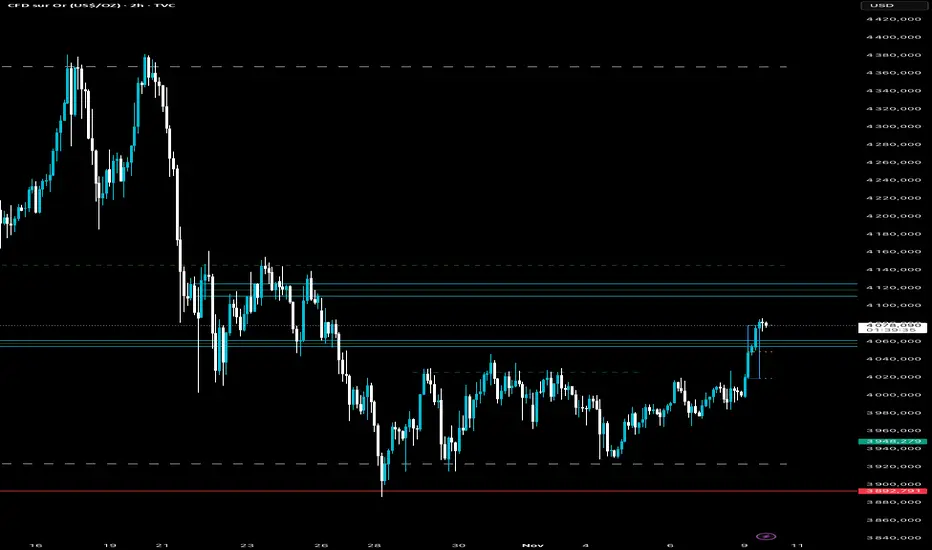 Gold confirme un reversal haussier technique après trois semaines de range entre 3948 et 4070. La cassure au-dessus de 4060 valide un break of structure (BoS) sur H2, projetant une extension haussière potentielle vers la zone de supply 4115 – 4130, avant un éventuel retracement.