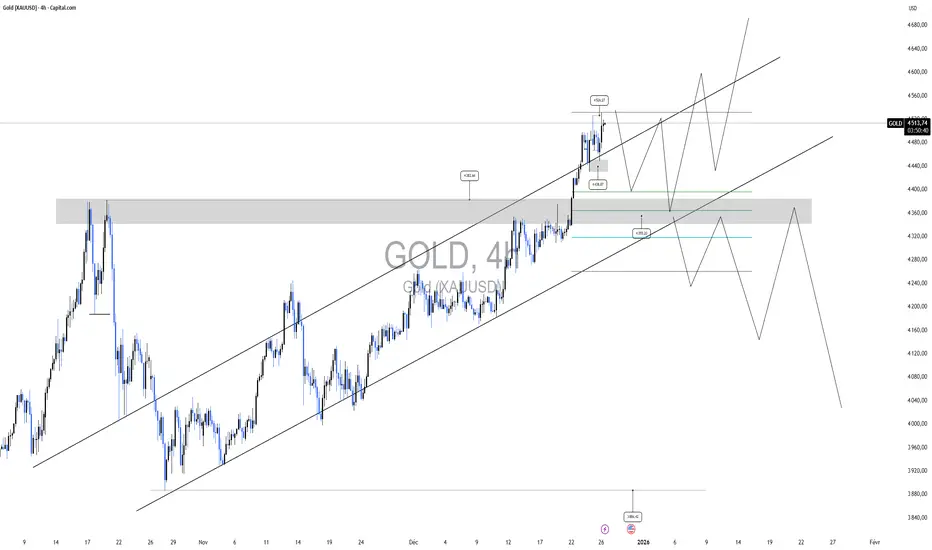 En ce 26 décembre 2025, on retrouve un Gold autour des 4 510$, toujours solidement installé dans sa structure haussière. Malgré la période des fêtes et une liquidité plus fine, le marché continue de respecter son canal ascendant, preuve que le flux de fond reste clairement bullish.